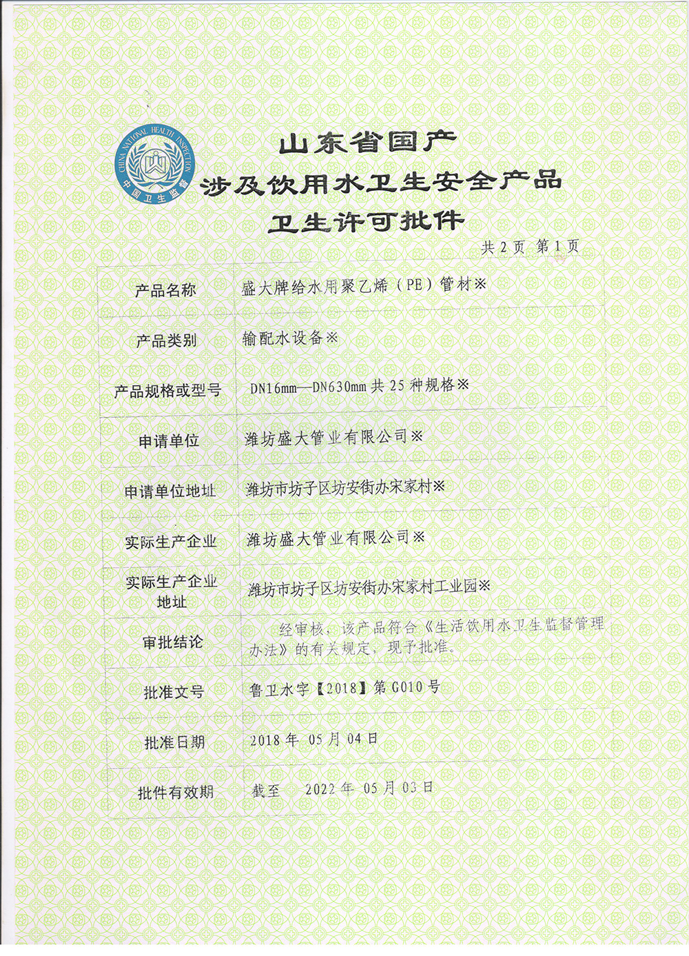 • 衛(wèi)生許可批件
